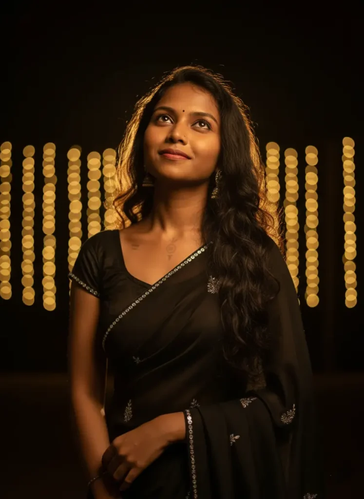 young women standing near glowing string lights at night. The women is wearing a stylish black saree, softly smiling and gazing upward with a dreamy expression. Background is dark and blurred, with warne golden bokeh lights creating a festive, magical atmosphere. Lighting is warm, glowing, and softy illuminating the face, with smooth shadows and depth of field for a professional studio-like.