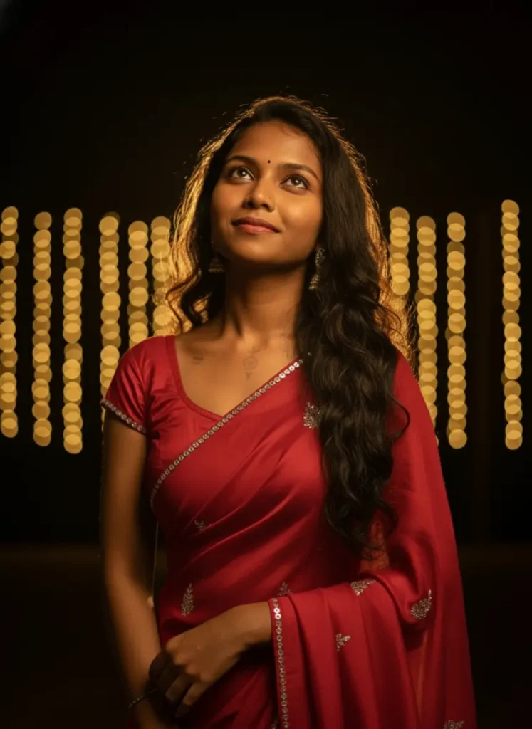 This prompt is perfect for those who love blending traditional attire with modern photography aesthetics — where every pixel glows with feeling.