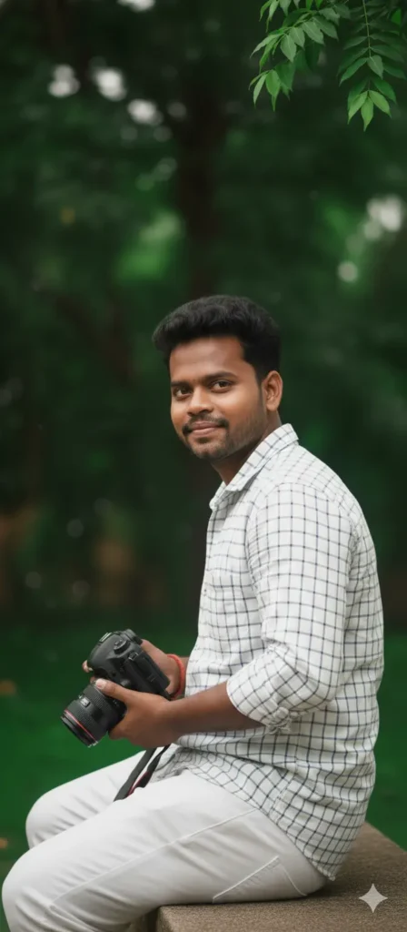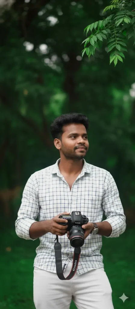 8K hyper-realistic cinematic portrait of the same man (reference face 100%), wearing a white-blue check shirt and white pants, standing against a dark green blurred forest background. Natural soft light, slightly moody contrast, candid smile, reflective emotion, Canon camera in hand, masterpiece-quality cinematic tone.